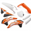 The plastic parts kit contains the two fork protectors and spoilers, the start number plates, or the headlight mask, the front fender, or the rear tail section, and the left and right filter box covers.